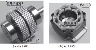 HB式電機不通過被磁化完成多極化,只是將永磁材料沿徑向方位被磁化為N極、S極,在其兩側夾上頸靜脈有小齒的轉子鐵芯,做成N極、S極沿徑向更替排序的多極轉子。定子則不在提升電磁線圈磁極總數的狀況下,在磁極靴部設定小齒。根據轉子和定子上的這種齒完成高像素、高步進角精密度。可以說它是VR和PM式的組成構造,因而被稱作復合型。圖3是它的轉子和定子的外型。